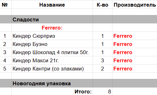Киндер Сюрприз (1 шт), Киндер Буено (1 шт), Киндер Шоколад 4 плитки 50 гр. (1 шт), Киндер Макси 21 гр. (3 шт), Киндер Кантри (со злаками) (2 шт)
